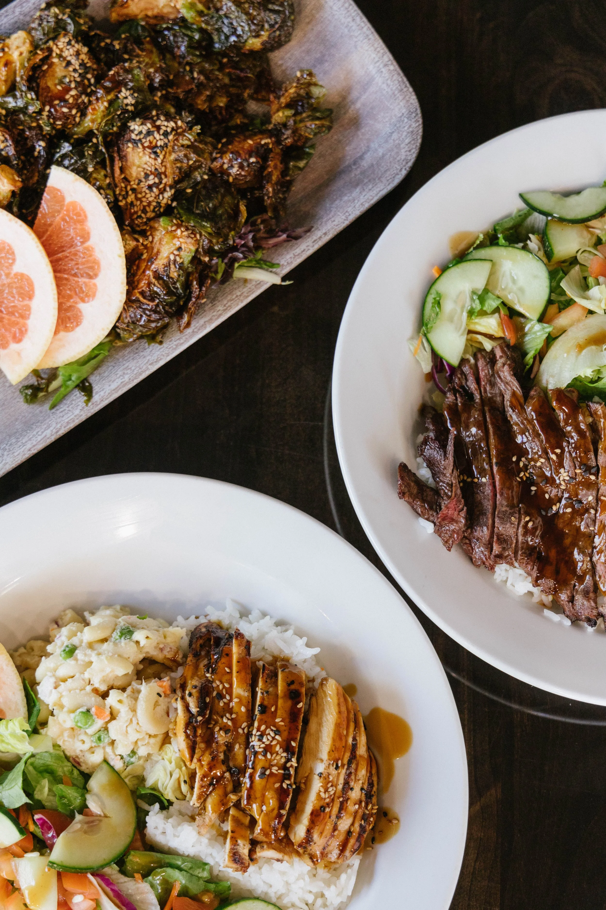 Two options of protein: Hawaiian BBQ Chicken, Hawaiian BBQ Beef, Kalua Pork