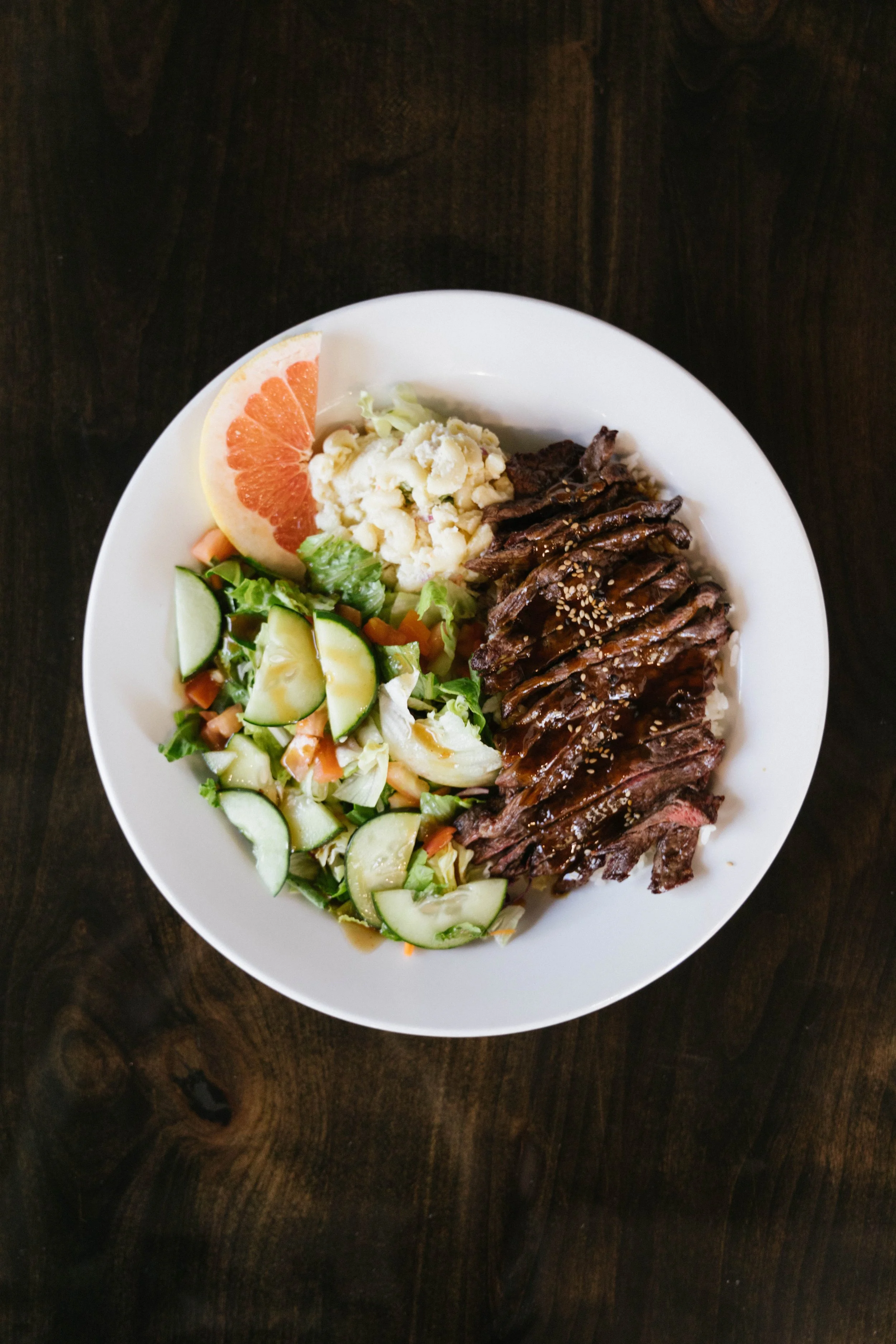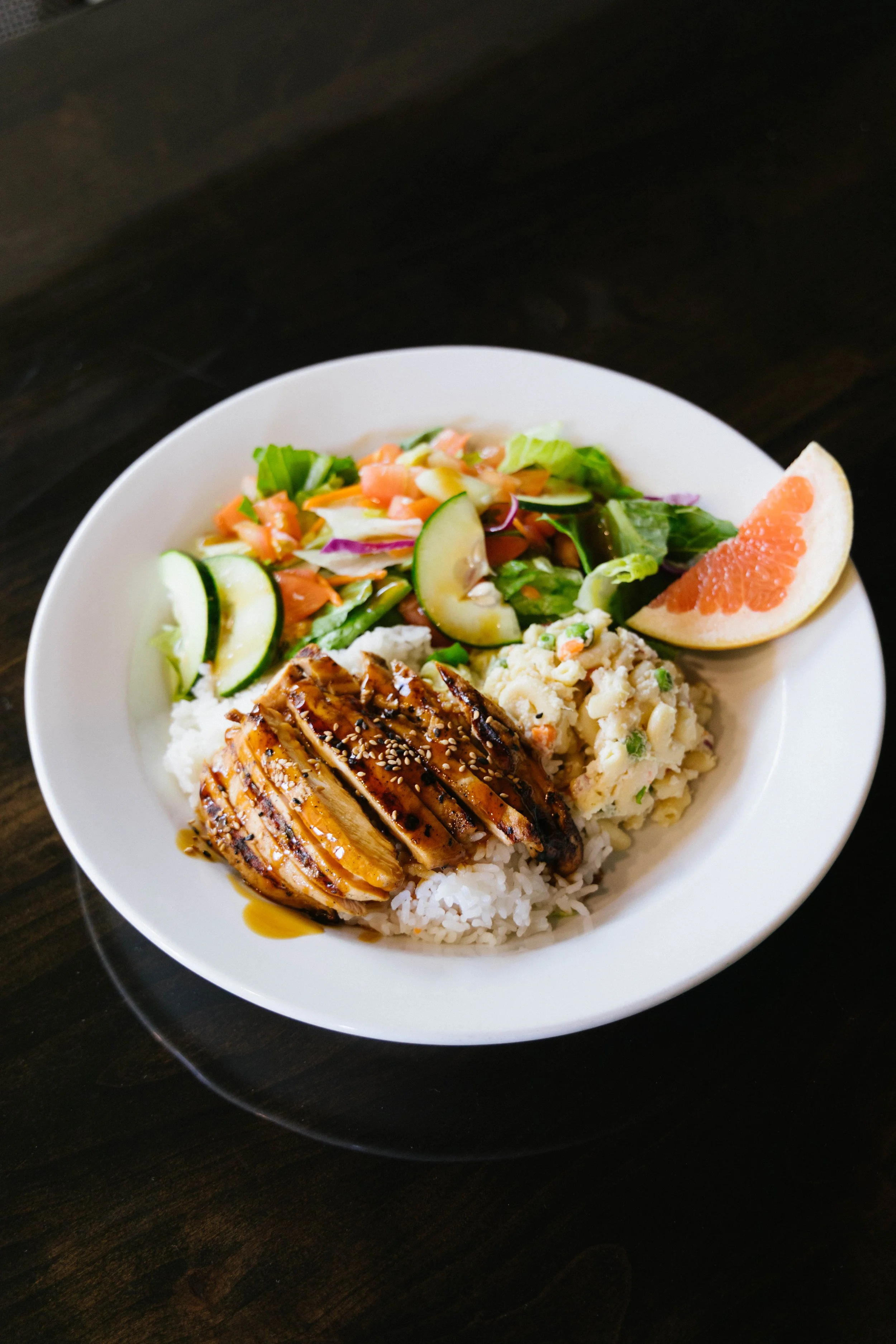 Served with a teriyaki glaze, white rice, macaroni salad, mixed vegetable, mixed green salad with sesame ginger dressing